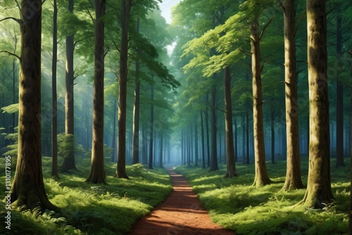 © haiqiang, Fototapeta premium painting of a path in a forest with tall trees and green grass