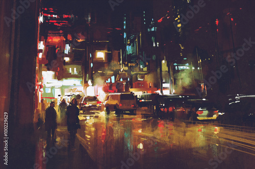 © grandfailure, Fototapeta premium painting of night street with colorful lights
