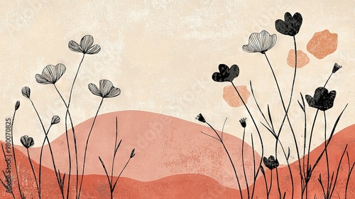 © Igor, Naklejka premium Painting of red-beige background with black-white flowers