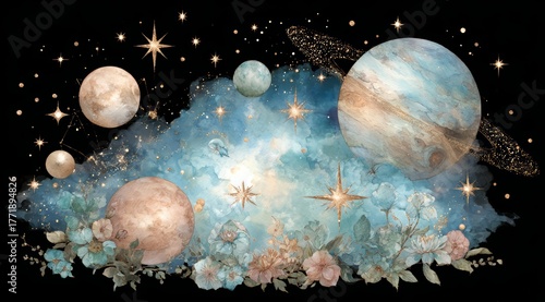 © panumas, Fototapeta premium Painting of the planets in the solar system with a blue sky and flowers. The painting is full of stars and planets