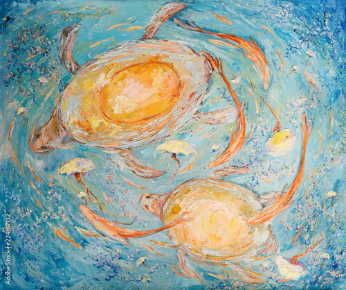 Naklejka premium Painting oil on canvas - Two yellow turtles, fishes and jellyfishes swimming...