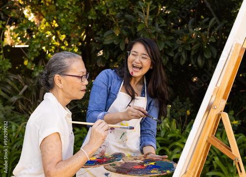 Obraz premium Painting on canvas, Asian granddaughter and grandmother enjoying outdoor art activity together