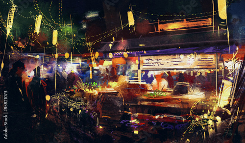 Fototapeta premium painting showing colorful market at night ,movement on people walking