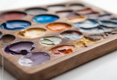 Naklejka premium paints art isolated white palette wooden photo various closeup painting...