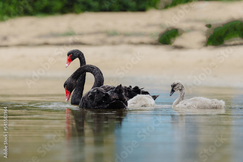 Fototapeta premium Pair of adult Black Swans with their baby juvenile swans, swimming in at...