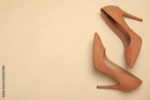 © New Africa, Fototapeta premium Pair of beautiful shoes and space for text on color background, top view