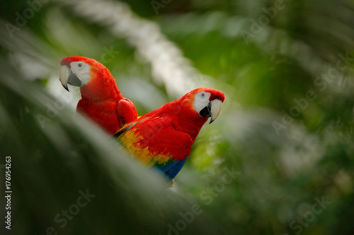 Fototapeta premium Pair of big parrot Scarlet Macaw, Ara macao, two birds sitting on branch, Brazil. Wildlife love scene from tropic forest nature. Two beautiful parrot on tree branch in nature habitat. Green habitat.