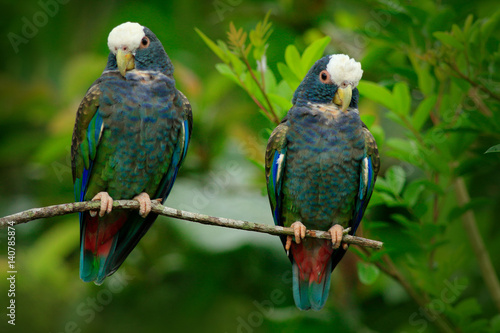 © ondrejprosicky, Obraz premium Pair of birds, green and grey parrot, White-crowned Pionus, White-capped Parrot, Pionus senilis, in Costa Rica. Love on the tree. Parrots courtship in the nature. Pair of parrots in the tropic forest.