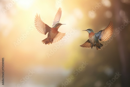 Obraz premium Pair of birds in flight against a dreamy blurred background, creating a...