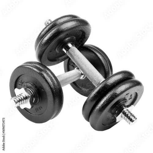 © Muhammad, Naklejka premium Pair of black iron dumbbells resting on a white background, showing the metal discs and bar