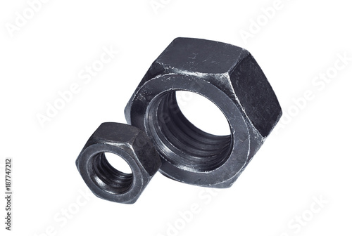 © onlooka, Obraz premium Pair of black screw-nuts isolated on white background