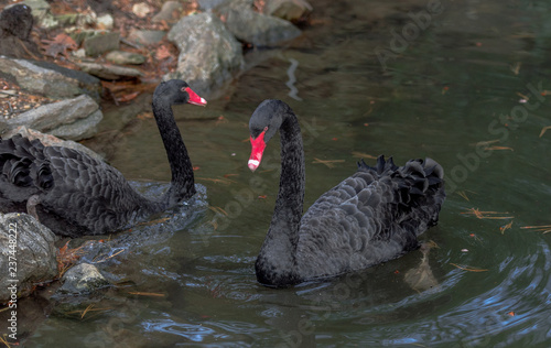 © dan, Fototapeta premium Pair of Black Swans Swimming in a Rippling Pond
