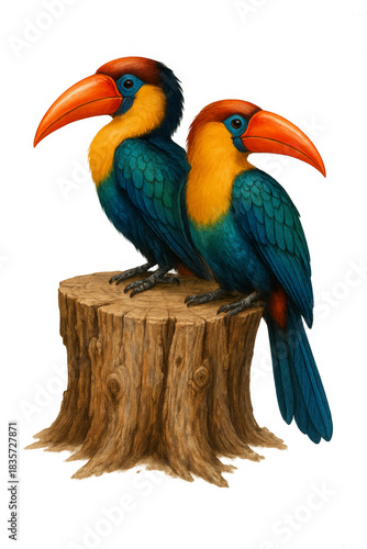 © Boris, Obraz premium Pair of colorful toucans perched on a tree stump