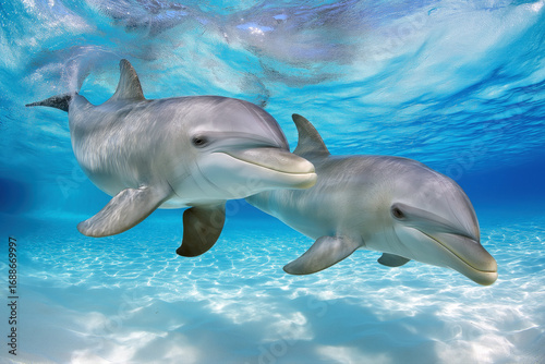 Naklejka premium pair of cute dolphins underwater in aquarium pool close-up