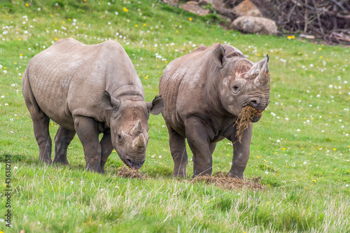 Naklejka premium Pair of Eastern Black Rhino's Standing on Grass Feeding