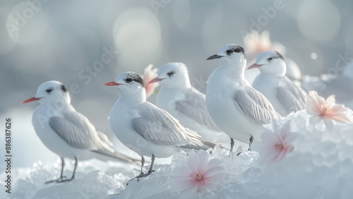 © Paskarik Igor, Obraz premium Pair of Elegant Arctic Terns Perched on Icy Surface at Sunset