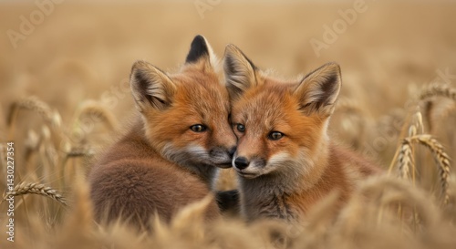 © Ura, Fototapeta premium Pair of fox cubs nestled in golden wheat, looking curiously at the camera.