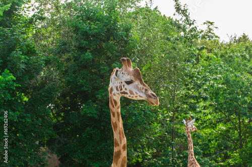 © satura_, Fototapeta premium Pair of giraffe portrait seeing necks and heads on green leaves background