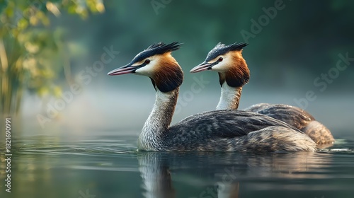 Fototapeta premium Pair of great crested grebes swimming together on misty lake water at dawn, showcasing elegant breeding plumage and synchronized movement.