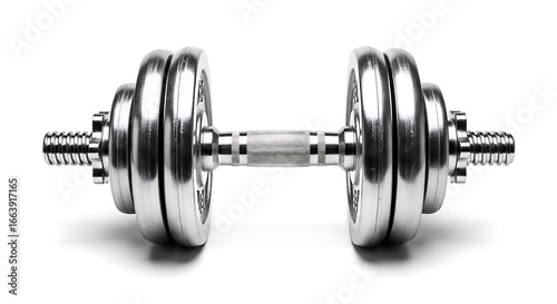 Fototapeta premium Pair of metallic dumbbells, isolated on white background, ready for exercise.