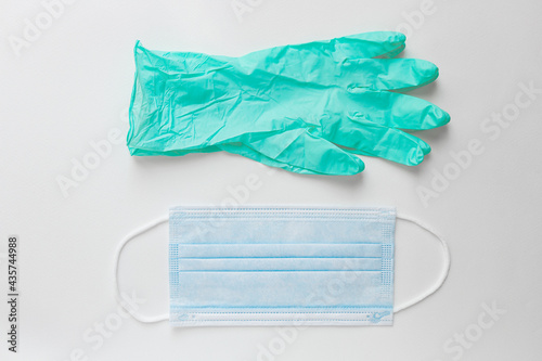 © Nadezhda, Fototapeta premium Pair of mint nitrile disposable gloves and sitgical face mask lie on white table. Safety first concept.