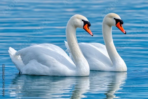 © Lubos Chlubny, Fototapeta premium Pair of mute swans swimming together on blue water