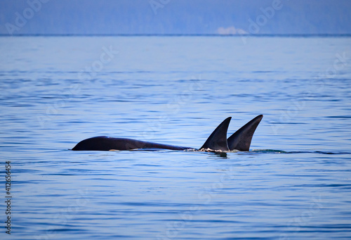 © Jo, Fototapeta premium Pair of Orcas gently swim through Glacier Bay in early morning