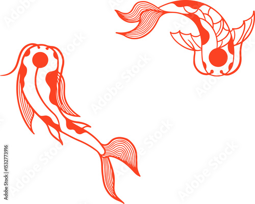Fototapeta premium Pair of ornamental koi-like fish are circling in transparent background line...