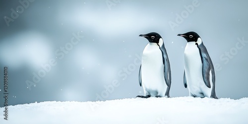 Fototapeta premium Pair of penguins on an icy surface, crisp details against a softly blurred snowy backdrop