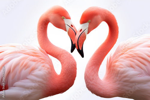 Obraz premium Pair of pink flamingos making a love heart shape at Jersey Zoo isolated on a white background, Generative AI