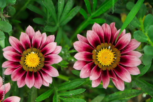 © Hasib, Obraz premium Pair of pink gazania with green leaf on background