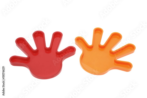 Fototapeta premium Pair of Plastic Toy Hands on White Background