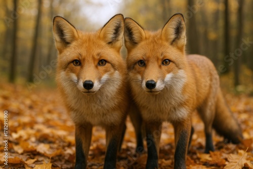 Fototapeta premium Pair of Red Foxes Standing Alert in Autumnal Forest, Captivating Wildlife...