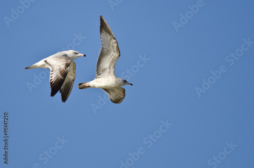 Obraz premium Pair of Ring-Billed Gulls Flying in a Blue Sky