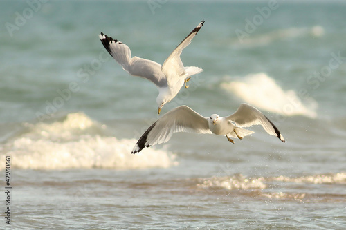 Fototapeta premium Pair of Ring-billed Gulls (Larus delawarensis) Foraging in Flight over Lake Huron - Grand Bend, Ontario, Canada
