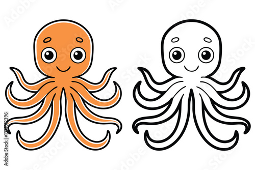 Fototapeta premium Pair of Smiling Octopus Cartoon Characters, Orange Color Version and Black Outline Style