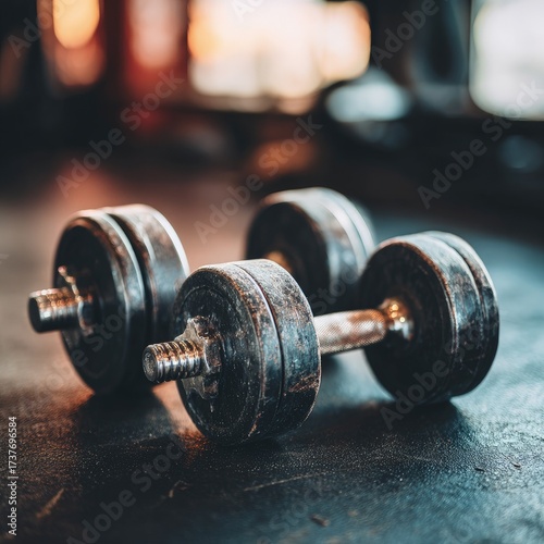 © DaniCreative, Naklejka premium Pair Of Vintage Dumbbells On Dark Gym Floor