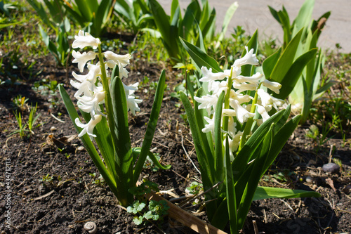 Obraz premium Pair of white flowered hyacinths in March