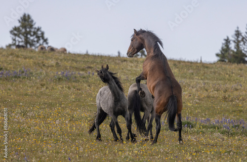 Fototapeta premium Pair of Wild Horse Stallions Fighting in Summer in the Pryor Mountains Montana