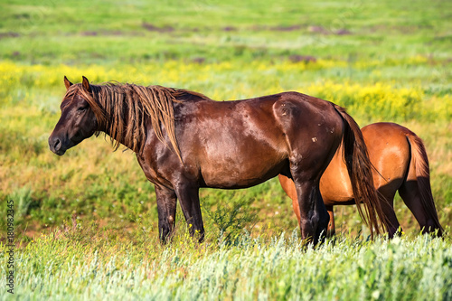 © Yakov, Fototapeta premium Pair of wild horses grazing on summer meadow