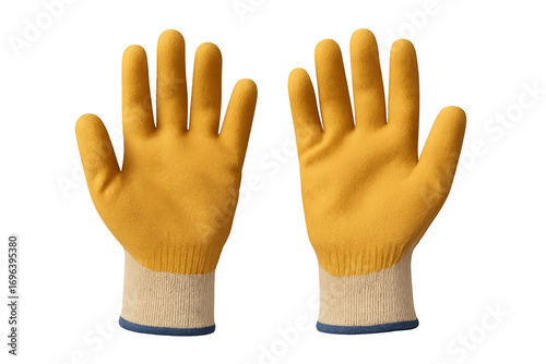 Obraz premium Pair of yellow work gloves showing open palms on transparent background