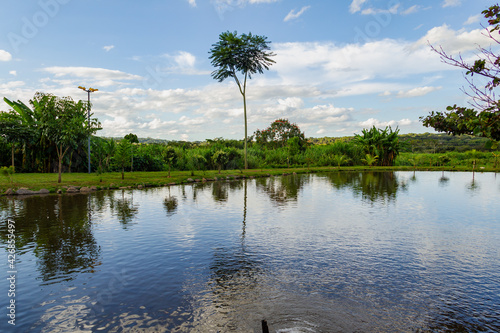 Obraz premium Paisagem. Foto do lago do Parque Balneário rodeado de árvores com céu azul...