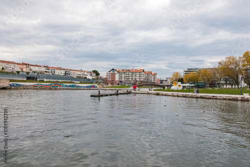 Obraz premium Paisagem serena vista do Cais da Fonte Nova, Aveiro, com seus canais...