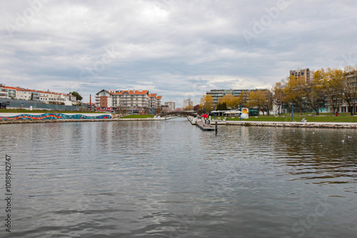 Obraz premium Paisagem serena vista do Cais da Fonte Nova, Aveiro, com seus canais...