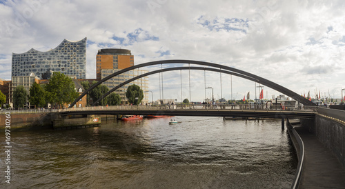 © acaballero67, Naklejka premium Paisaje al atardecer en el puerto de Hamburgo, con el puente y al fondo el edificio de la Ópera Alemania en el verano de 2017