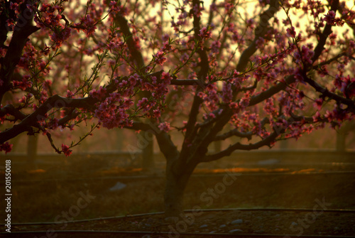 Fototapeta premium Paisaje con melocotoneros en flor, frutales, rosa, en primavera