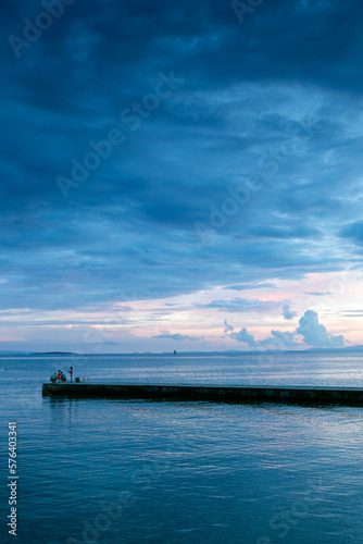 © menudomundo, Obraz premium paisaje de atardecer en la costa con una entrada de tierra en el mar y el cielo azulado y violeta