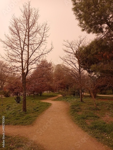 © Gabrieuskal, Obraz premium Paisaje de bosque en un día de calima con camino.
