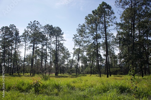 Obraz premium Paisaje de bosque y cielo azul en un día soleado