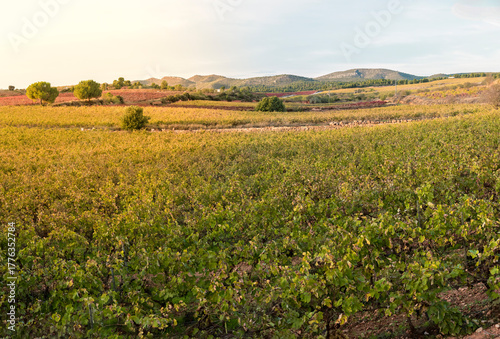 Fototapeta premium Paisaje de viñedos en otoño con suaves relieves al fondo en hora dorada, Requeba, Valencia, Spain